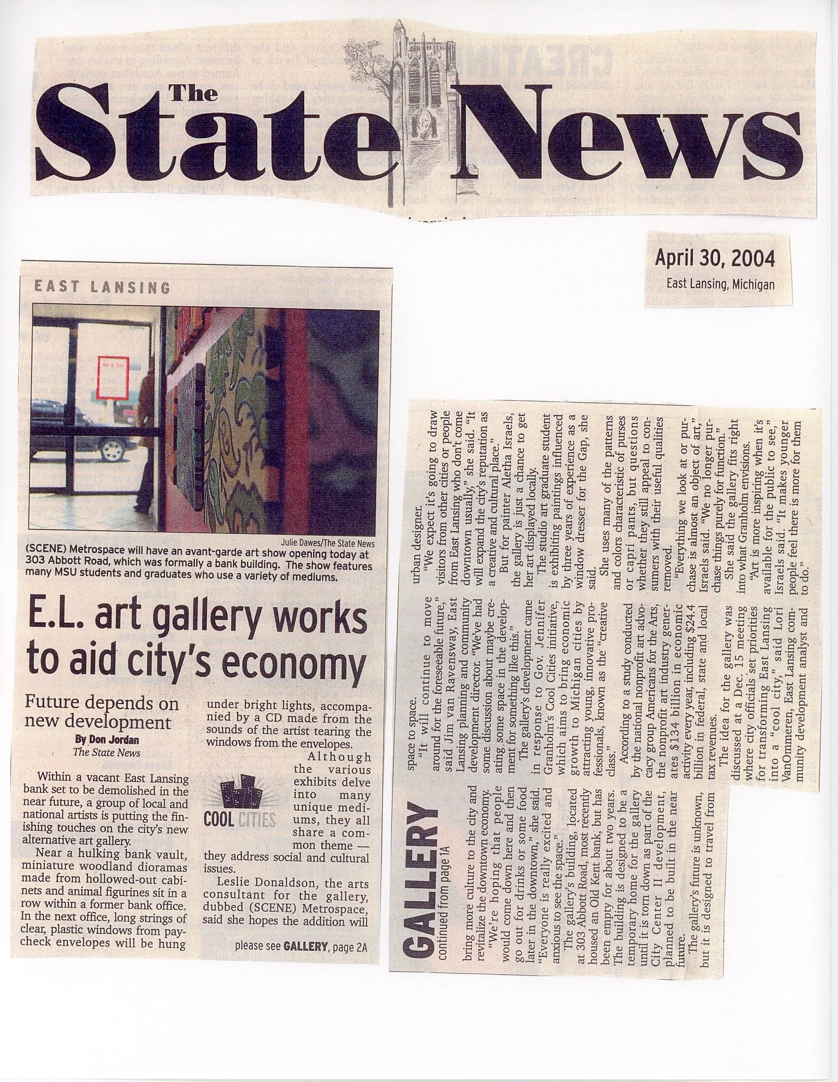 Leslie Donaldson launched (SCENE) Metrospace in 2004 in a donated vacant bank building in downtown East Lansing. Sanctioned by the City of East Lansing with support from the Downtown Development Authority, (SCENE) was initially designed to promote new and experimental artworks in vacant spaces. Supported by a team of volunteers and advisors, (SCENE) drew attention across the state and was recognized as a best practice creative placemaking model under Governor Jennifer Granholm’s Cool Cities Initiative. Today, (SCENE) continues to present contemporary exhibitions—now in a new location—with gallery management from Michigan State University’s department of Art, Art History & Design.
